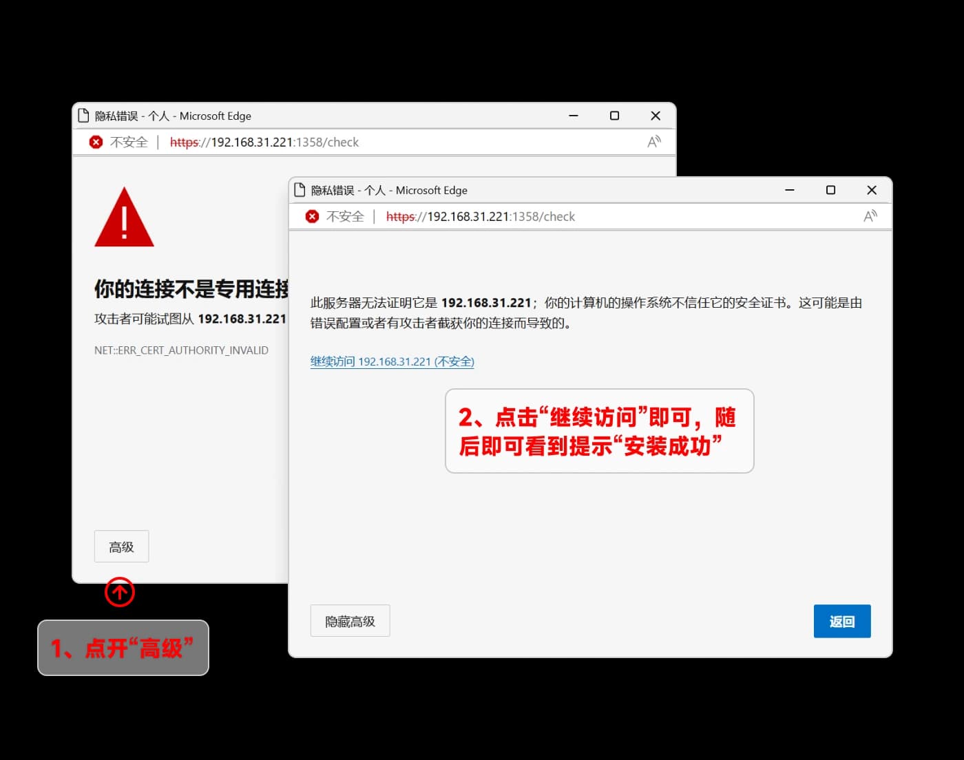 - 当您“连接到另一台设备”,并提示“证书不可用”时,点击“安装证书”,进入下方的证书下载页面: